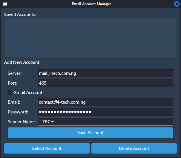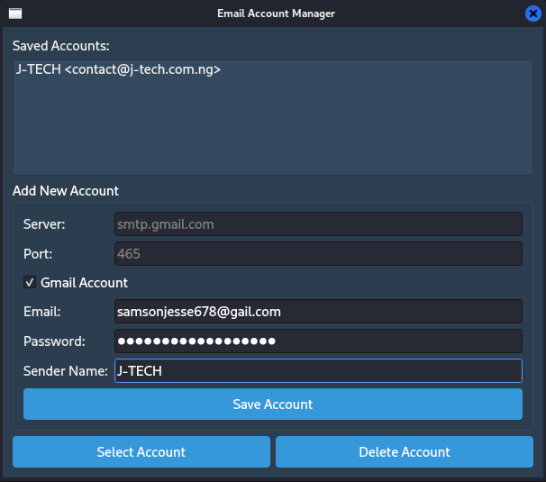 This is a full-featured desktop application developed by J-TECH using Python and PyQt5. It allows users to send professional bulk emails with support for HTML templates, file attachments, and CSV or TXT contact imports. The app includes a clean, intuitive interface with secure SMTP login, real-time sending progress, and powerful template management.